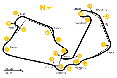 El circuito de Silverstone en Reino Unido, tiene una longitud es de 5,891 kilómetros. Durante la carrera se darán 52 vueltas al circuito cubriendo una distancia final de 306,332 kilómetros