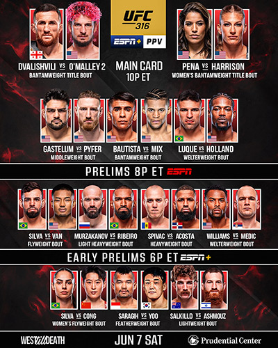 Además, UFC 316 contará con el duelo por el peso gallo femenino entre Juliana Peña y Kayla Harrison; la cual será su primera defensa de cinturón de su segundo reinado como campeona, tras su reciente victoria contra Raquel Pennington.