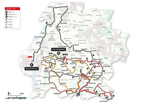 Será el colofón a un trazado de 256 kilómetros recorriendo cada rincón de la provincia de Limburgo en una locura de trazado entre las colinas del sur de Países Bajos. Una maraña de trazado con puntos por los que la carrera llega a transitar hasta en 4 ocasiones entre constantes idas y venidas.