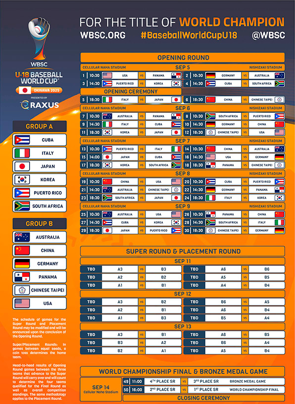 La Confederación Mundial de Béisbol y Softbol (WBSC) anunció el calendario oficial de la Copa Mundial de Béisbol Sub-18 2025 presentada por RAXUS, que se llevará a cabo del 5 al 14 de septiembre en la ciudad de Naha, Prefectura de Okinawa, Japón.