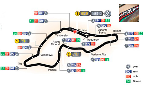 Su circuito, el Autodromo Enzo e Dino Ferrari es una pista mítica. Inaugurada en 1953, cuenta con 19 curvas, las más míticas y reconocidas: la Acque Minerali, Piratella, Tamburello y Villeneuve.
