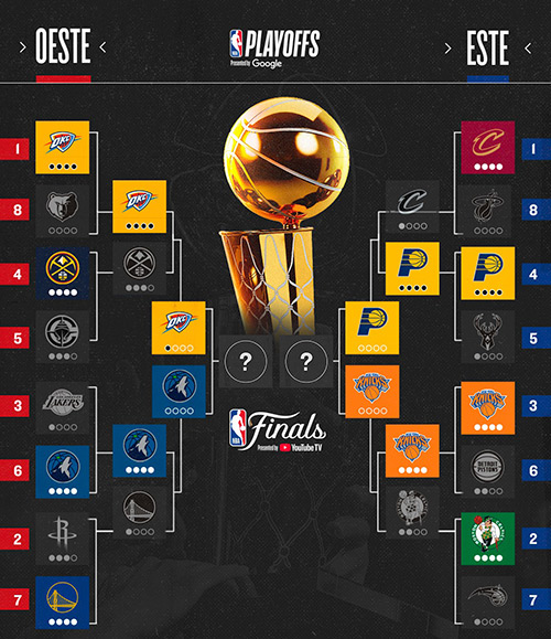 En la conferencia Oeste, Minnesota Timberwolves se enfrentan a los jóvenes de Oklahoma City Thunder. En el Este, el Madison Square Garden será el escenario de la serie entre los New York Knicks y los Indiana Pacers.