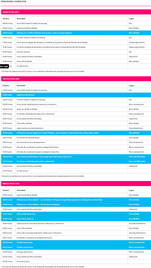 Se instalará un muro boulder con Auto Belay para escalada popular de aficionados y familias de 6 metros de alto x 12 metros de ancho desde el jueves 17 de julio y hasta el sábado 19 de julio. Estará dentro de una carpa de 20 metros de ancho x10 de fondo y 9 metros de altura, para que en todo momento esté el muro y la actividad en la sombra.