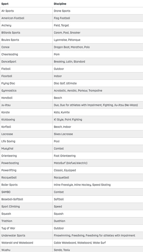 Los juegos TWG 2025 Chengdu incluirán algunos que no son parte de los Juegos Olímpicos. Entre ellos se encuentran deportes artísticos como gimnasia acrobática, aeróbica y rítmica, así como deportes de pelota como floorball, korfbal y raquetbol. Los resultados de los eventos, incluyendo los medalleros, se pueden encontrar en el sitio web oficial de los Juegos Mundiales y en otros medios deportivos.