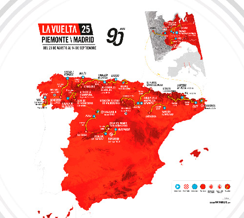 La carrera partirá el 23 de agosto de 2025 de Turín (Italia) y acabará el 14 de septiembre en Madrid. En total, 15 de las 21 etapas están catalogadas de media o alta montaña