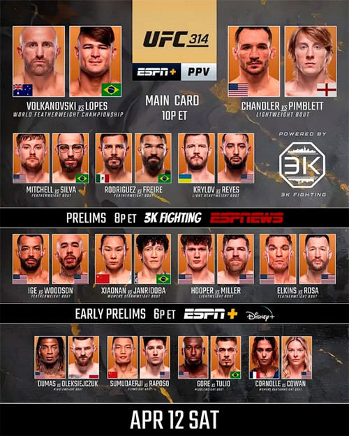 Los luchadoresse medirán en UFC 314 por el título del peso pluma, en la velada del 12 de abril en Miami.